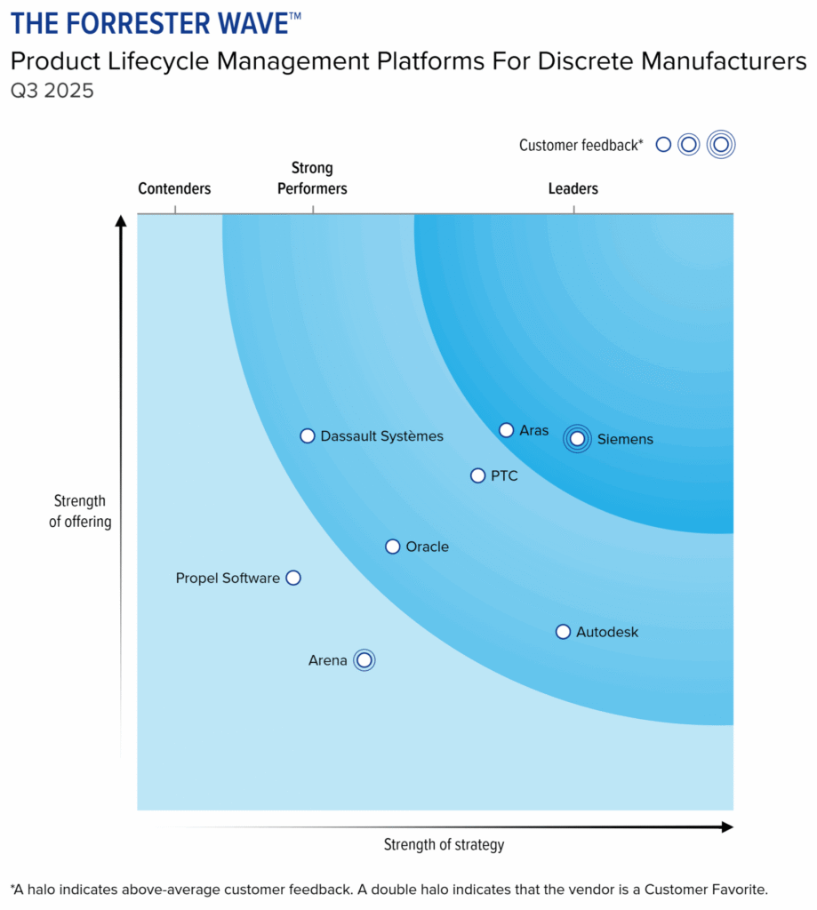 It is hardly a surprise that Siemens Digital Industries Software took the lead in analyst Forrester's latest assessment, "The Forrester Wave: Product Lifecycle Management Platforms For Discrete Manufacturers, Q3 2025". But the fact that only one of the other PLM developers managed to take a place in Forrester's "leaders wave" may have raised some eyebrows. Instead, it was the "small" player Aras PLM, known for its Innovator platform, that managed to take the top spot next to Siemens. This while Dassault, PTC, and Autodesk all ended up outside the "leadership wave" with a position at the level below, the "strong performers wave".